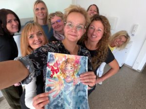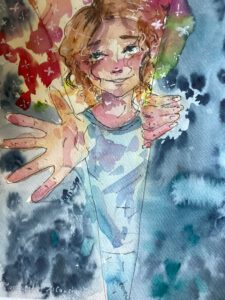 Dieses Bild hat unsere MFA Schülerin Margaryta Siroochenko gezeichnet. Ihr Motto war: „Aus etwas herausbewegen“. In diesem Fall heraus aus (Prüfungs-) Stress, hinein in positive Gefühle und innerer Kohärenz.
